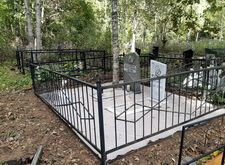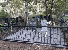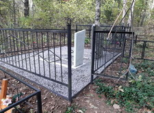 Клиент заказал достаточно экономное покрытие серой гранитной крошкой. Для того, чтобы трава в дальнейшем не прорастала, мы затянули территорию места захоронения (а также пространство внутри цветников) геотекстилем. Параллельно с этим по периметру участка установили железную полосу, препятствующую выпадению крошки за территорию могилы.